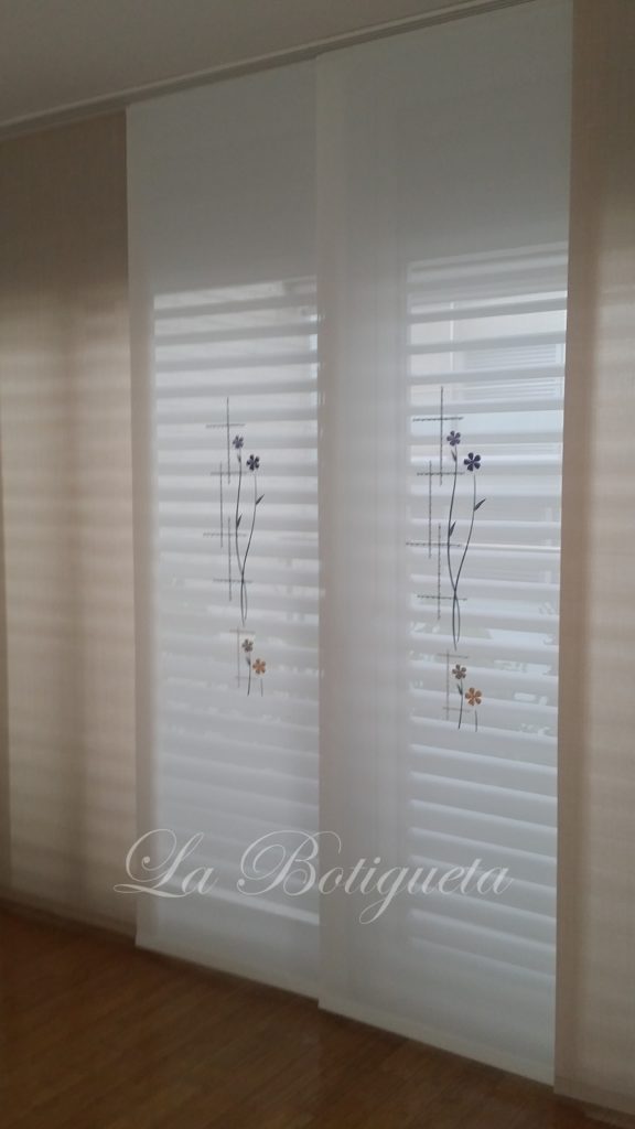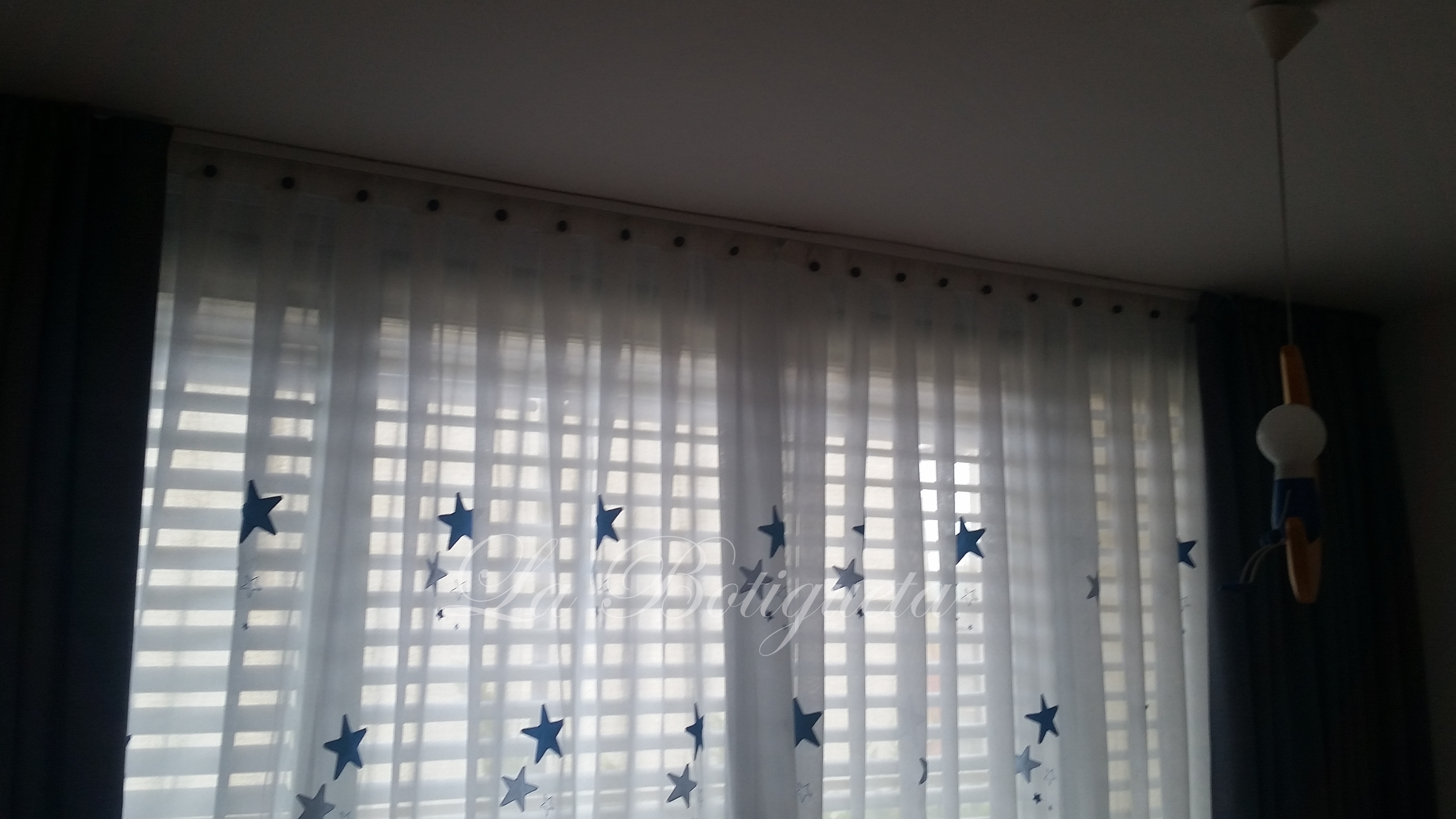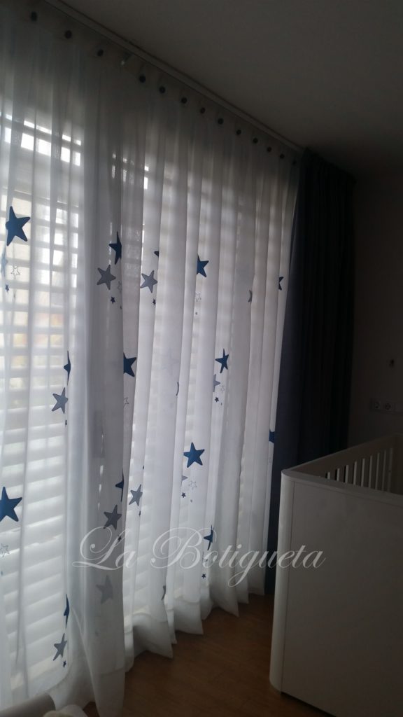 En esta casa han optado por paneles japoneses en habitación principal y salón, sus cristaleras son grandes y con los paneles se ha conseguido que las cortinas no ocuparan excesivo espacio en las estancias. Los tejidos utilizados son técnicos, bordados e imitando la seda natural, se han hecho varios paneles de colores que encajen entre ellos, para ir cambiándolos, con colores más subidos en verano por la entrada de luz y más claros en inviernos dejando pasar toda la luz. En habitación niños hemos instalado un visillo con estrellas azules aplicadas, la parte de arriba se ha confeccionado con medias palas con botones forrados azul. Al no tener persiana se ha instalado delante del visillo foscurit azul en tejido de fácil mantenimiento.